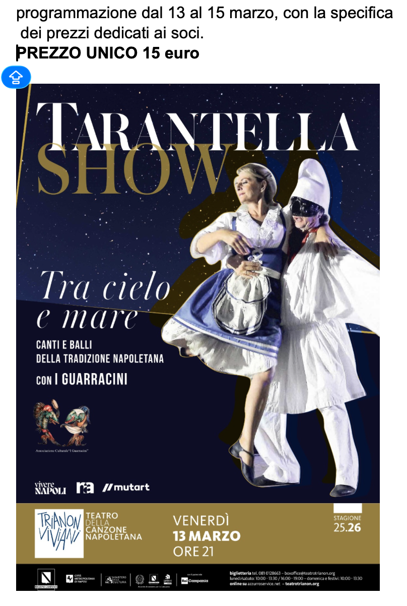 Stabile della Canzone Napoletana, presenta un abbinamento della canzone classica napoletana in una location storica,dove le persone visitando anche il Complesso monumentale, con le sue chiese, il chiostro, sculture, quadri, la tomba di Dracula, possono alla fine ascoltare un concerto di MUSICA CLASSICA NAPOLETANA. COSTO 15 EURO; per gli iscritti cral SOLO 10 euro al netto contributo-sconto cral.